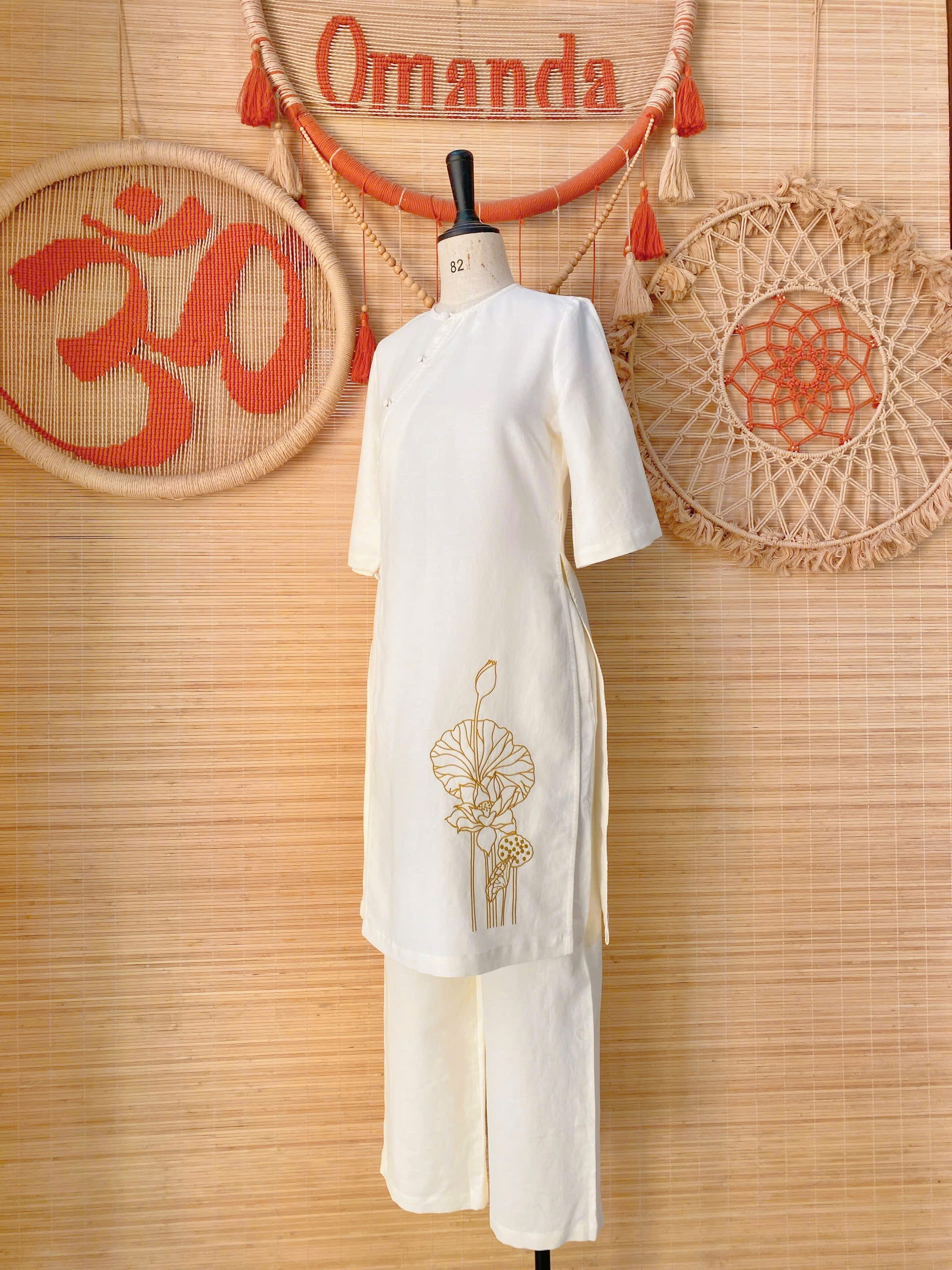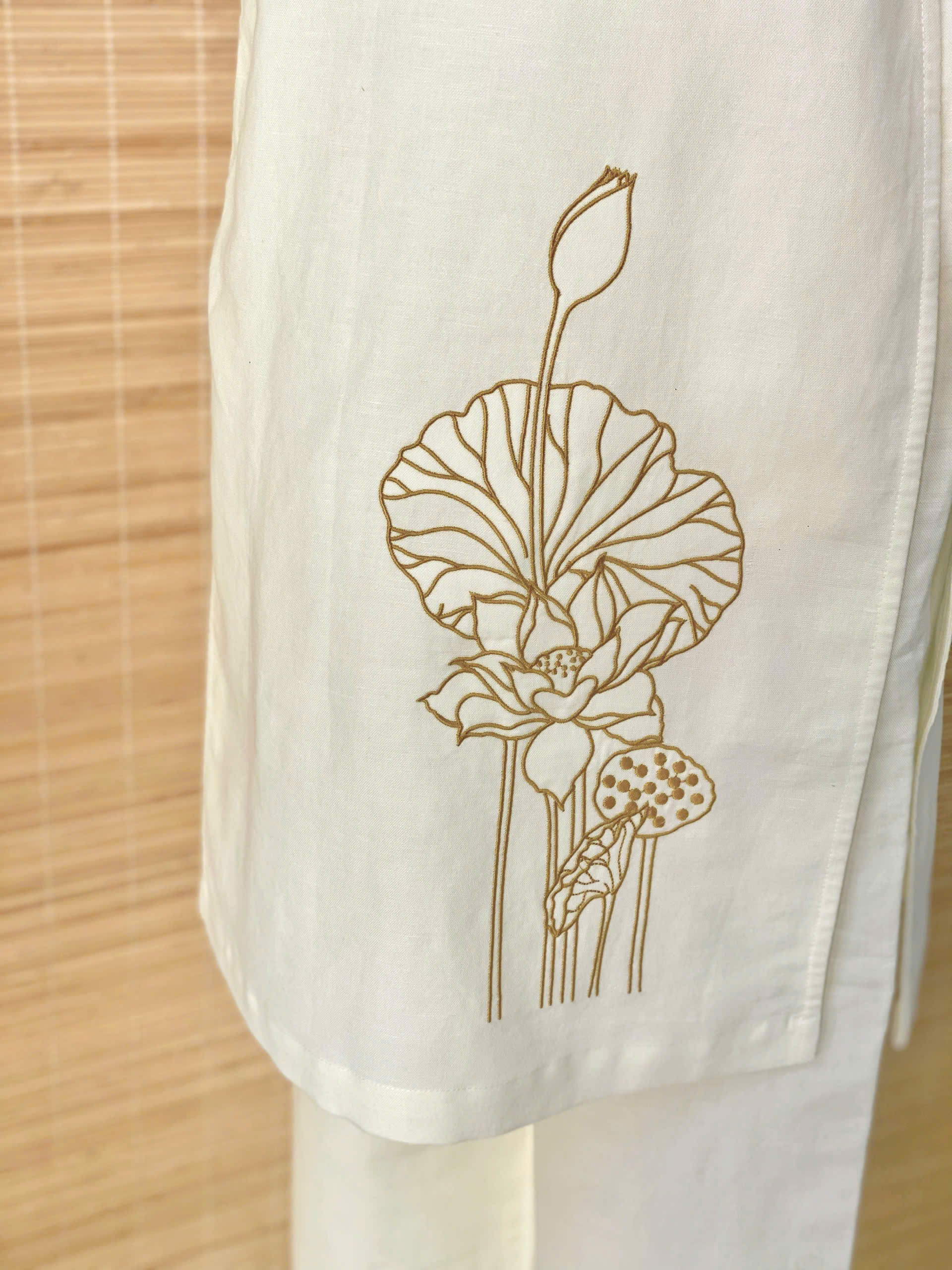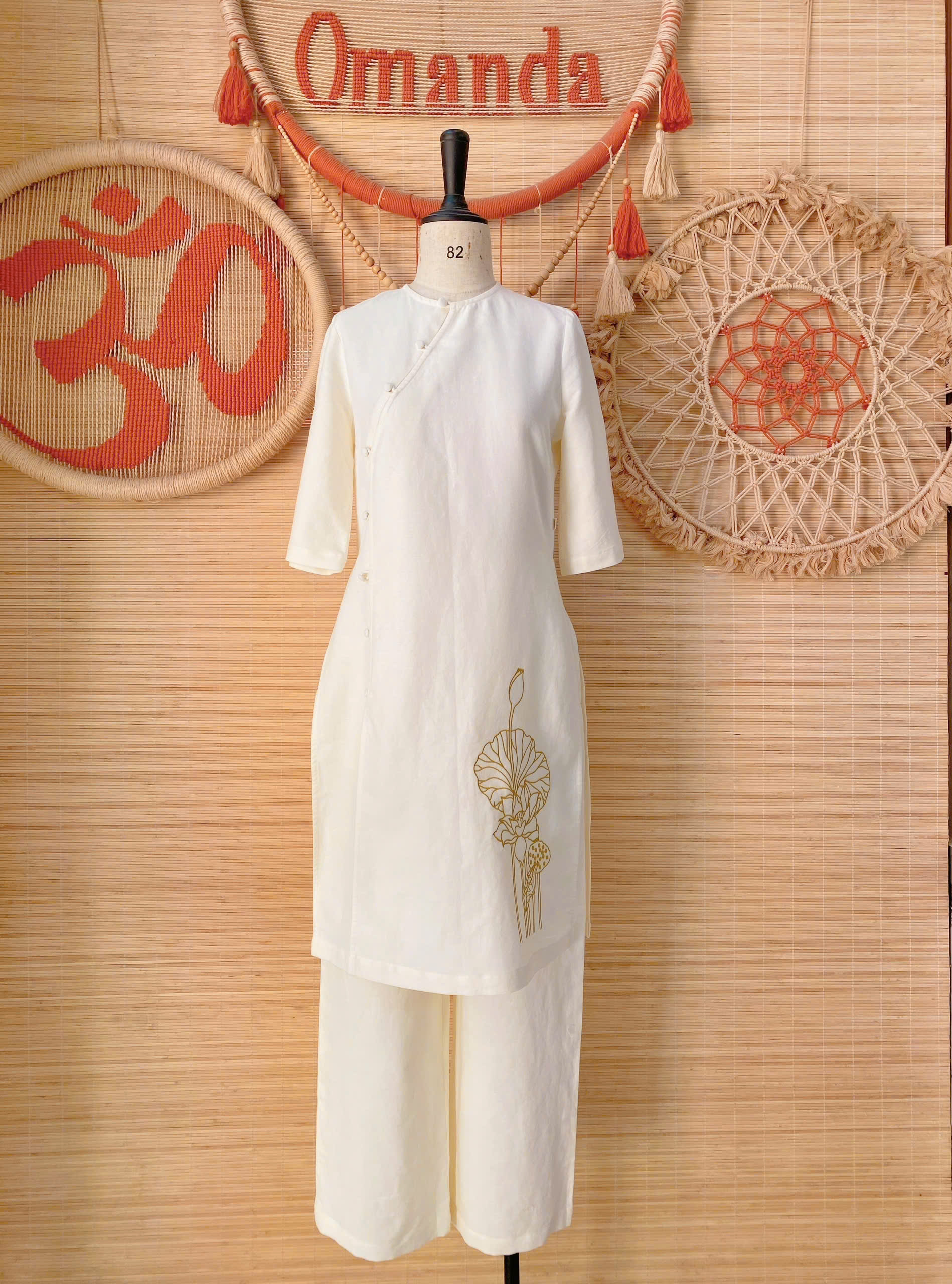 An Tuệ có 2 phiên bản: phiên bản thêu lá Gingko ( lá Bạch Quả ) trên nền lụa trắng tinh và phiên bản thêu hoa sen trên nền linen lụa trắng kem